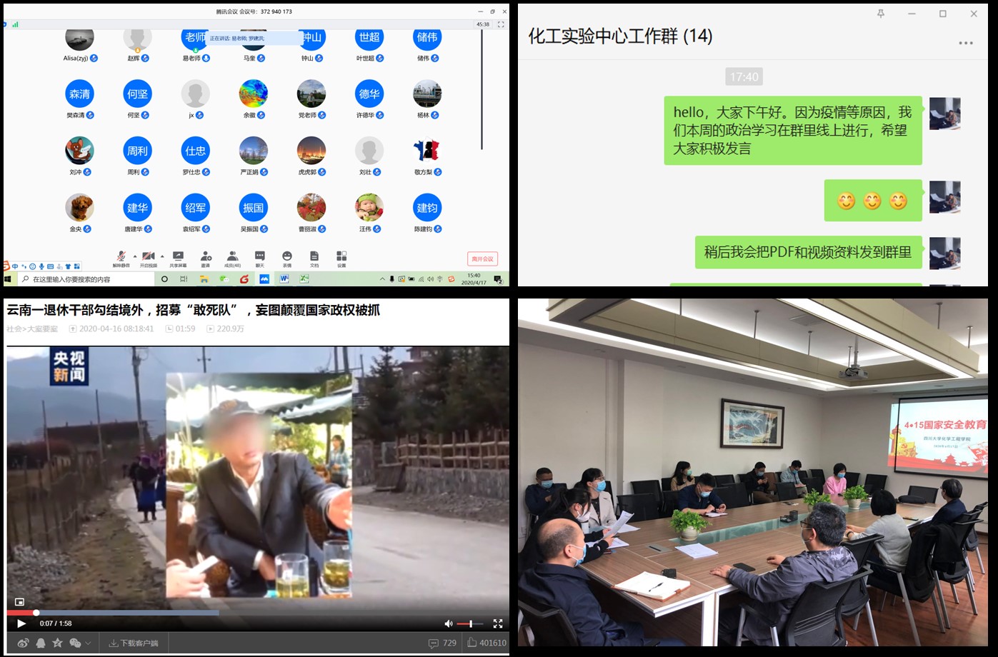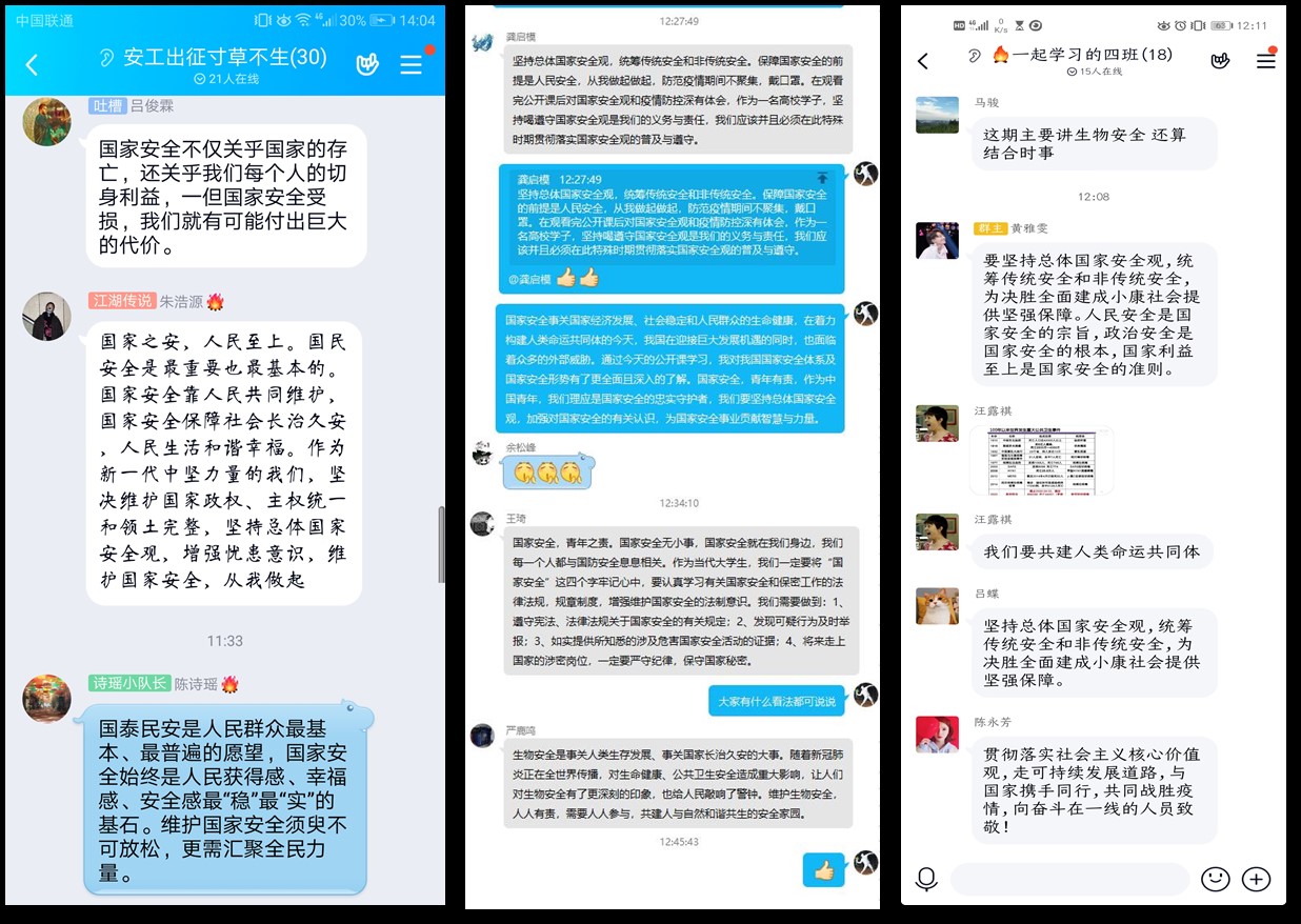 工艺专业、生工专业、冶金专业、制药专业、过控专业、安全工程专业的所有班级团支书组织同学于4月14日线上观看了教育部录制的2020年全民国家安全教育日高校公开课,并就公开课内容开展了主题“云”班会进行线上讨论交流学习。同学们都有感而发,通过公开课的学习,对国家安全有了更深的认识和理解,增强了国家安全意识和社会责任感。并承诺在今后的学习生活过程中,会自觉维护国家安全、严格保守国家秘密,为构建安全、和谐、稳定校园而努力。