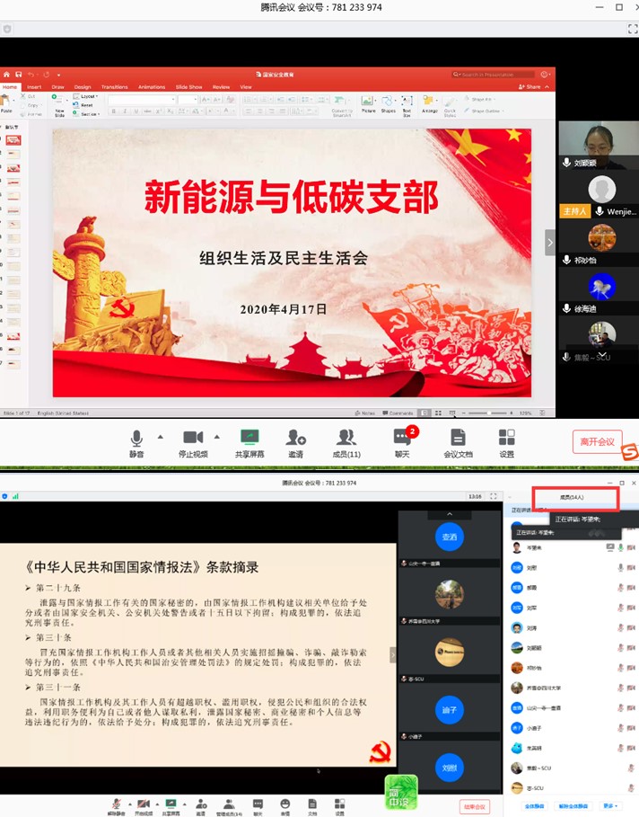 多个党支部也开展了线上支部活动。通过党支部云学习,大家认识到了公民保守国家安全的重要性和必要性,强化了维护国家安全和社会稳定的意识。并结合《国家安全法》、《反间谍法》、《网络安全法》、《中华人民共和国国家情报法》、《中华人民共和国境外非政府组织境内活动管理法》中部分内容的学习,针对高校师生可能接触及重点注意的地方进行了讨论。