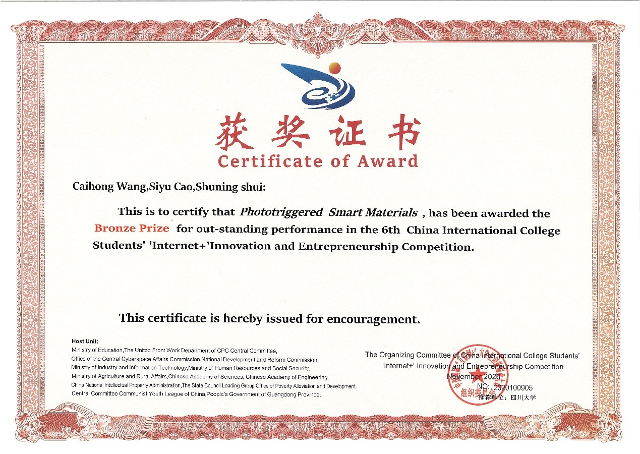 王彩虹老师的参赛项目“Phototriggered Smart Materials”获全国总决赛铜奖,成为AV研究所