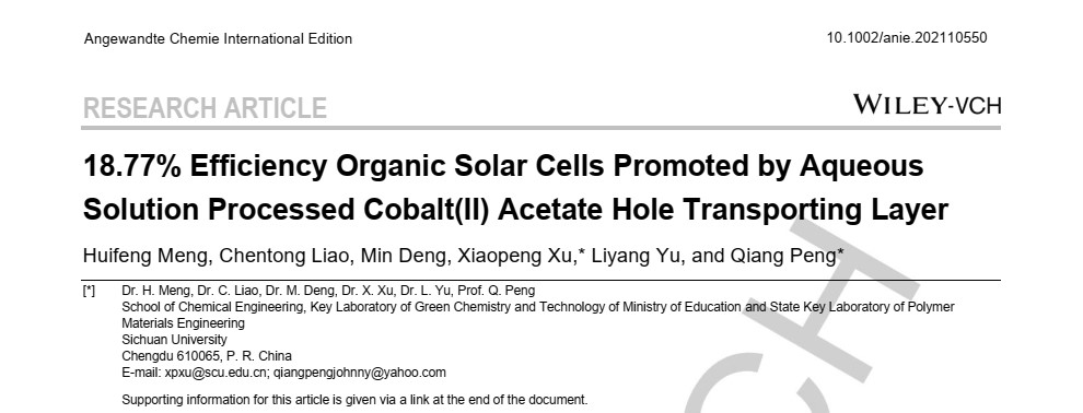 彭强教授课题组在Angew. Chem. Int. Ed.上发表题为“18.77% Efficiency Organic Solar Cells Promoted by Aqueous Solution Processed Cobalt(II) Acetate Hole Transporting Layer”的研究论文。该课题组开发了一种基于醋酸钴的新型空穴传输层材料及其水溶液绿色制备工艺,将有机太阳能电池二元器件的能量转换效率提高到目前最高的纪录18.77%。AV研究所