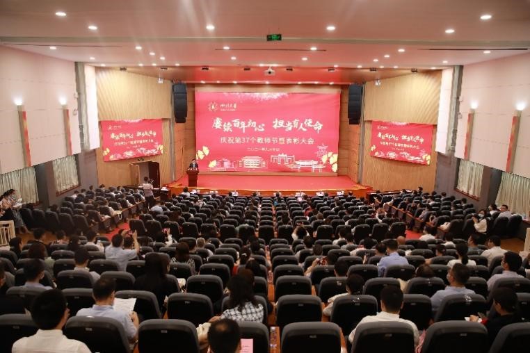 赓续百年初心,担当育人使命。为深入学习贯彻习近平总书记给全国高校黄大年式教师团队代表回信精神,激励全校教职员工向黄大年同志等优秀教师学习,立德树人,做大先生,9月10日,学校在望江校区笃行楼召开庆祝第37个教师节暨表彰大会。校党委书记王建国、校长李言荣等全体校领导,高洁院士,杰出教授曹顺庆、罗志田、钟本和、詹石窗等高层次人才,机关各部处及业务实体主要负责人,各学院书记、院长,2021年先进集体和先进个人,2021年“立德树人奖”获奖教师,2020年度宝钢奖获奖教师,2021年“未来教学名师奖”获奖教师、第七届“姜维平优秀教学奖”获奖教师、第八届“卓越教学奖”获奖教师、离退休教师代表和学生代表参加大会。会议由副校长张林主持。