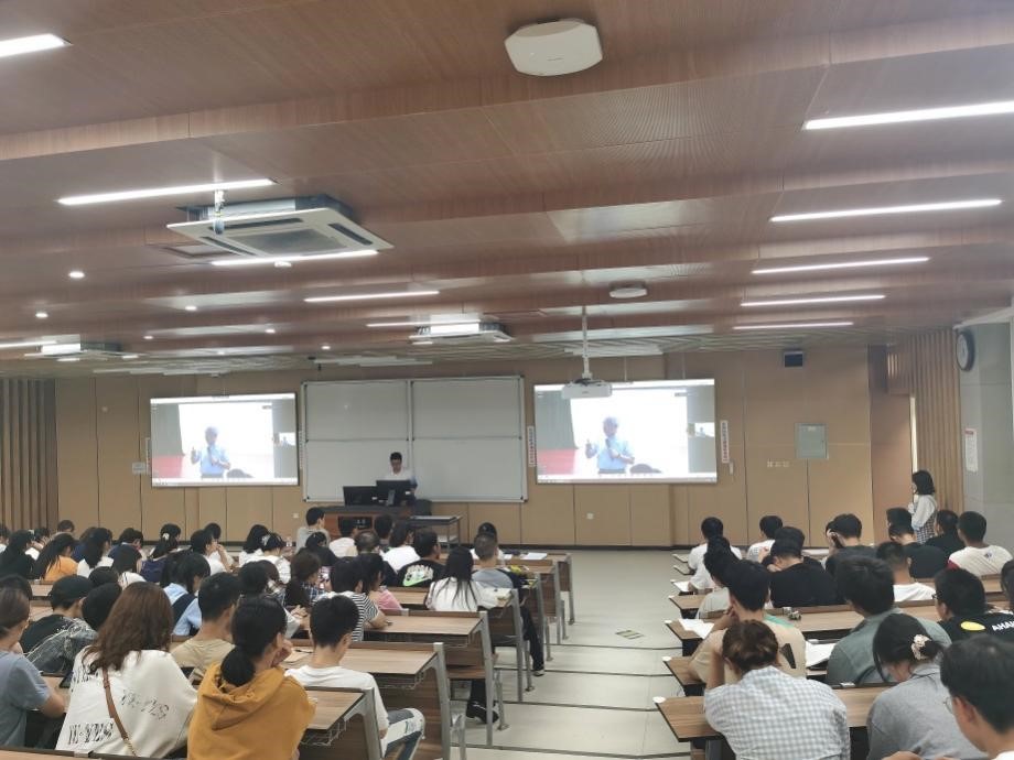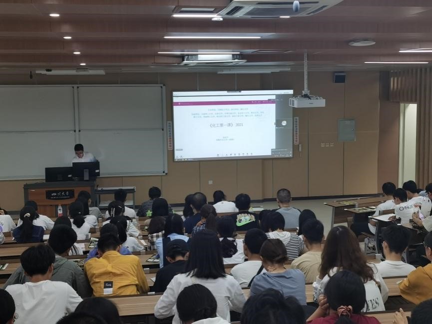 朱教授用诙谐幽默的语言,生动形象的描述,为同学们深入浅出地阐释了“化工一句话,化工一页纸,化工一首诗”的深刻含义。首先,朱教授从宏观层面阐释了化学工程相关专业与世界变化千丝万缕的关系,在世界飞速变化的“modern science”大环境下,有了化工,才衍生出冶金、石化、高分子等相关产业;其次,朱教授为同学们着重强调并分享了化工行业在医药、健康、航空、航天等领域的贡献,以此鼓励同学们积极投身化工产业的建设,为祖国复兴强盛攻坚克难,力争上游;最后,朱教授为我们分享了他心目中的“化工一句话”(化工是有关材料与化学品生产与加工的学科,强调安全、可持续地盈利)和他亲自编写的“化工一首诗”(《化工之歌》),以院士的严谨与青年般的朝气,为化工新生展示了一幅化工科研的美好图景。