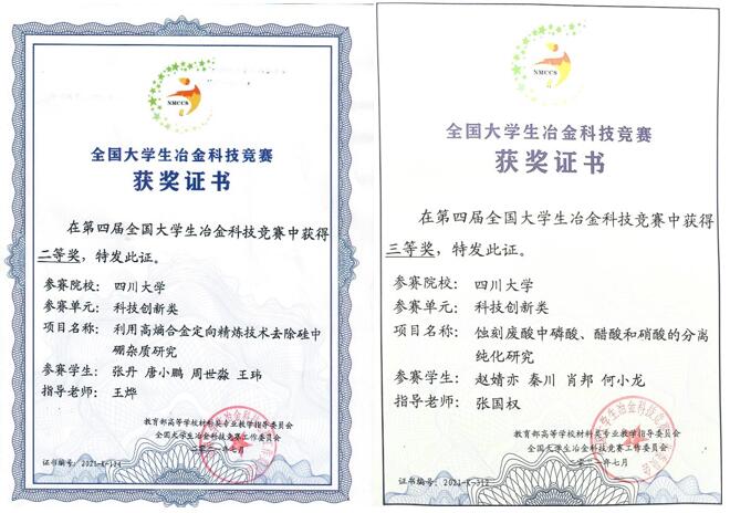 王烨副教授指导的张丹、唐小鹏、周世淼、王玮团队凭借参赛作品《利用高熵合金定向精炼技术去除硅中硼杂质研究》荣获全国二等奖;