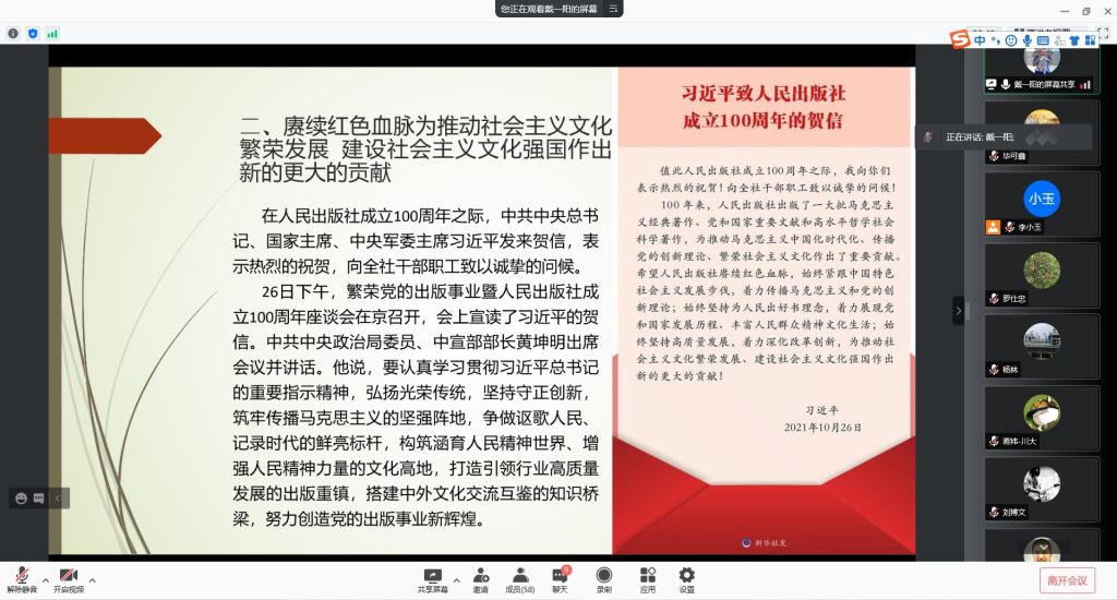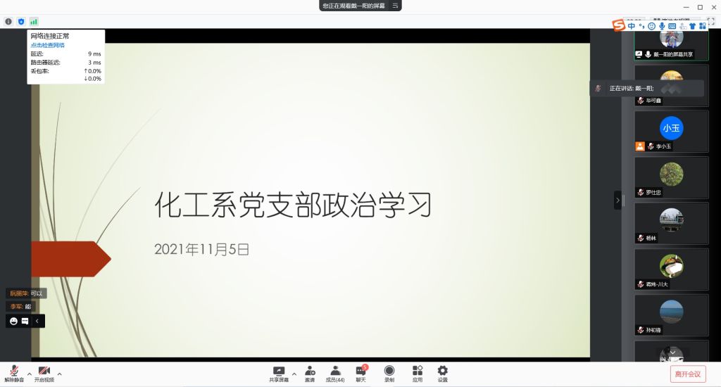化学工程系全体教师于2021年11月5日下午通过腾讯会议开展了的政治学习和组织生活。化学工程系党支部书记谢锐同志主持了本次政治学习和组织生活,系统工程党小组戴一阳同志负责领学了政治学习文件,系主任袁绍军同志进行了业务工作研讨。
