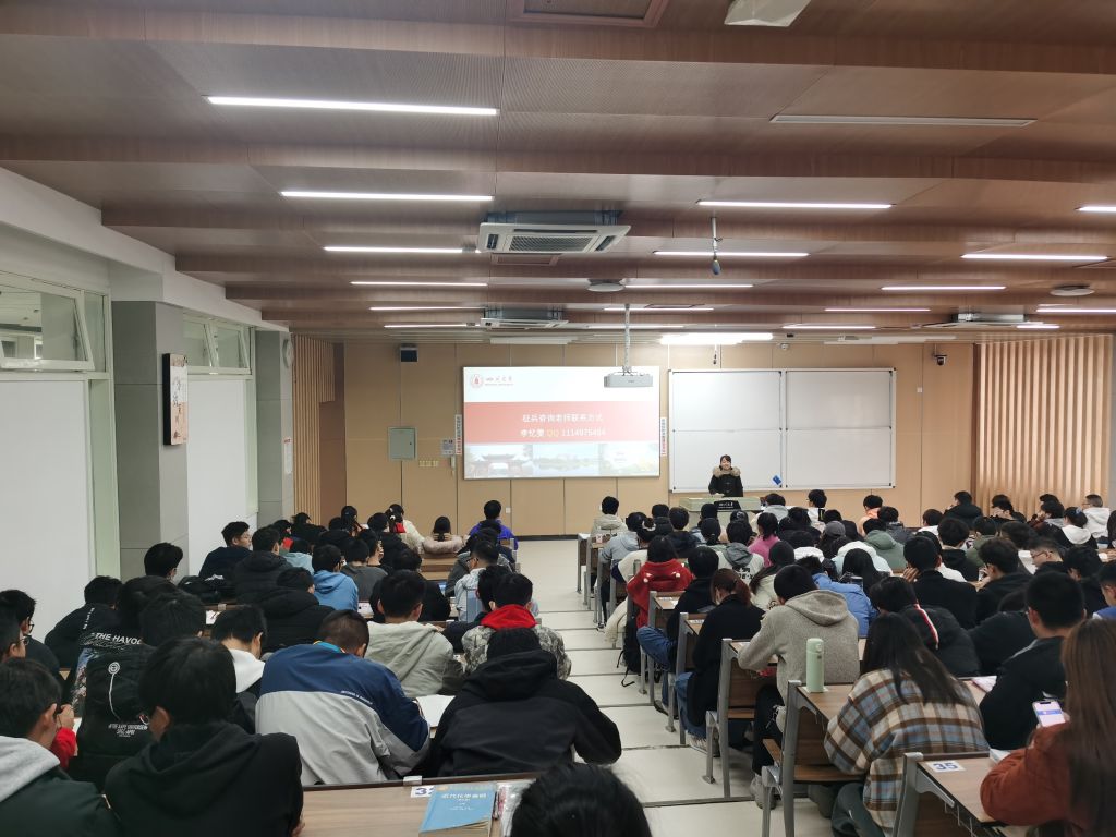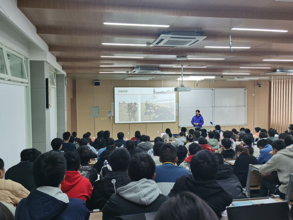 讲座之初,由王承宇率先发言。他曾服役于中国人民武装警察部队且获多项荣誉。他首先就“为何要从军”的话题,从实践爱国情怀、履行从军义务、磨练个人品格等方面进行了深入浅出的分享。他认为,从军是收获宝贵的战友情谊、磨炼坚毅的斗志和顽强的品格、实现以身报国伟大理想的大好机遇。同时,政府及我校为入伍大学生提供了诸多优惠条件,如津贴补助、创业补贴、学费全免、助学贷款偿还、考研加分、优先转专业……凡此种种,不一而足。这是祖国、人民、学校“希望寄予青年”的实际表现。然后,王承宇耐心解答了同学们关于参军的相关问题,并向踊跃提问者发放了纪念品。他希望同学们的青春岁月在无私奉献中愈加珍贵,强军报国,不负韶华,不负党和人民的殷切期望。