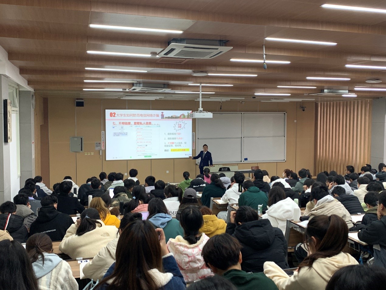 宣讲会第二部分,围绕“防范电信网络诈骗”的主题展开。王红明行长列举了“高薪网络兼职”、“出借身份证件”、“‘双十一’退款骗局”、“订票诈骗”、“投资理财骗局”等例子,既充分阐释了骗术的层出不穷,也为同学们长鸣警钟。他推荐同学们下载“国家反诈中心”应用软件,认真学习反诈骗知识,保护个人安全及家庭幸福。