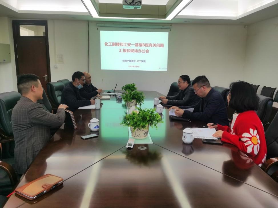 在李天友、郭孝东等陪同下,华国春一行实地踏看了化工副楼使用情况。在学院235会议室,李天友介绍了望江化工副楼和江安一基楼B座基本情况和存在的问题。赵长生提出,学院建设一流学科,需要良好的硬件条件保障,希望学校资产管理处支持学院建设,帮助学院一揽子解决目前存在的问题。双方就学院下一步开展公房管理工作进行了深入讨论和研究。华国春处长就AV研究所