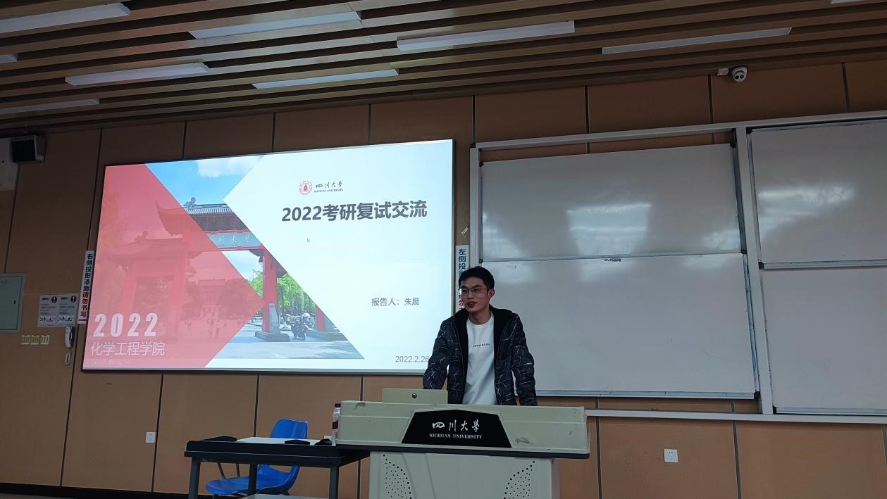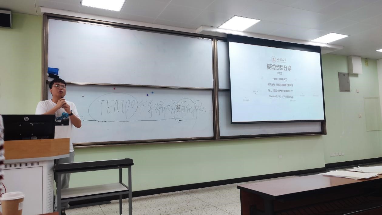 接下来,2021级制药工程专业硕士生余德洪、材料与化工专业硕士生杜宏志为同学们分享了自己在准备考研复试过程中的心得体会与经验,包括复试流程的介绍、专业课的复习、英语的准备、简历制作、个人陈述的PPT完善等,对考研学子的复试准备提供了细致指导。随后2021级生物与医药专业硕士生张欢与能源动力专业硕士生朱晨也为同学们带来了精彩的分享,除了复试流程的讲解外,他们结合自身经历为同学们讲授了许多复试小技巧,鼓励同学们认真准备的同时放松心态,预祝同学们取得优异成绩。