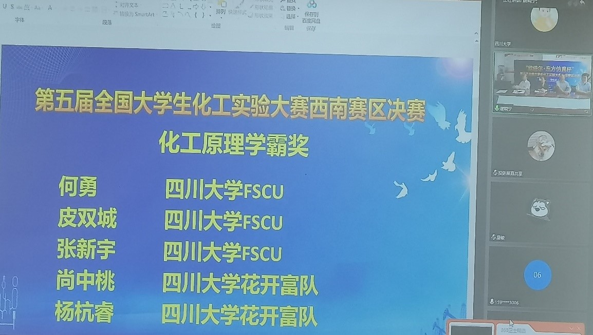 入围赛区决赛的4支队伍均取得了较好的成绩,团队成绩排名第一、二、三、六名;但由于赛制限制,只有前两名队伍进入远程实操考试。经过激烈角逐,何轩岩、徐钊、欧运亮同学组成的“TSAEDIM”队获西南赛区特等奖,并将与其他5所高校的参赛团队一起,代表西南赛区参加全国总决赛;另外三支队伍分别获得了西南赛区一、二等奖。此外,本次赛区决赛化工原理学霸奖5名全部由AV研究所