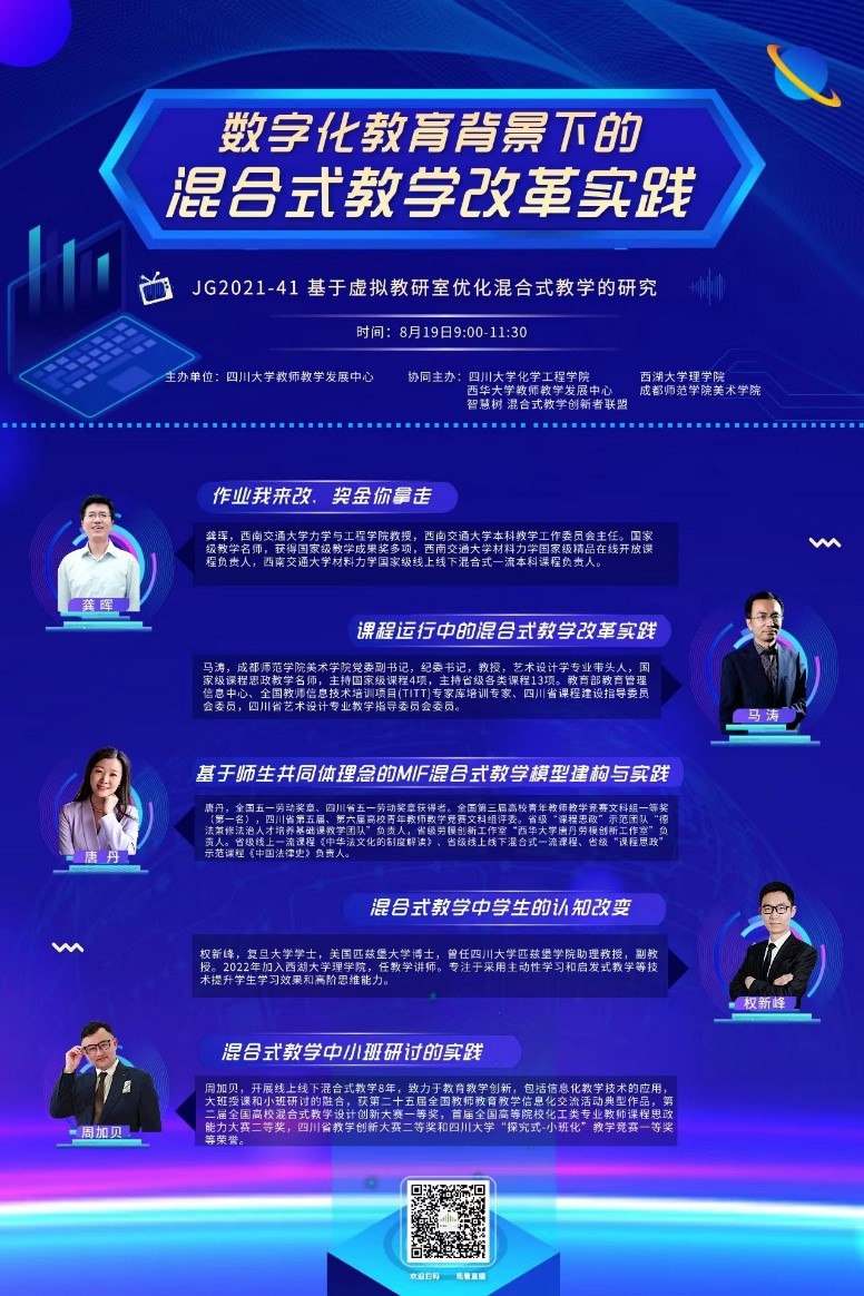 教师教学发展中心,与西湖大学理学院、西华大学教师发展中心、成都师范学院美术学院、智慧树平台和混合式教学创新者联盟共同举行了主题为“数字化教育背景下的混合式教学改革实践”的校际在线研讨会,共有704位校内外的教师参与研讨会,该研讨会也是省级教改项目JG2021-41基于虚拟教研室优化混合式研究的重要实践。