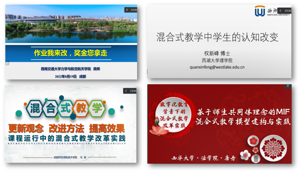 教师教学发展中心林祎老师以“数字化建设为支撑高质量教育体系是应对新阶段人才培养挑战的必然选择”为主题的发言,随后由西南交通大学本科教学工作委员会主任龚晖教授、成都师范学院美术学院党委副书记马涛教授、西华大学全国五一劳动奖章获得者唐丹副教授、西湖大学权新峰博士及本学院周加贝副教授做研究专题报告,报告题目依次为《作业我来改,奖金您拿走》、《课程运行中的混合式教学改革实践》、《基于师生共同体理念的MIF混合式教学模型的建构与实践》、《混合式教学中学生的认知改变》和《混合式教学中小班研讨的实践》。从混合式教学设计、教学实施、考核评估设计等方面进行了分享,通过理论与实操相结合的方式,帮助任课老师厘清混合式教学创新的内涵、路径及常见方法,介绍使用工具,实现高阶人才培养和有效研讨。会议由周加贝副教授主持及总结发言,并针对老师在线提出的问题进行解答。
