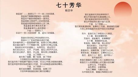 七十华诞的祝福。最后进行抽奖环节,精致的礼品让被抽到的同学收到了诸多艳羡的目光。至此,主持人宣布晚会圆满结束。