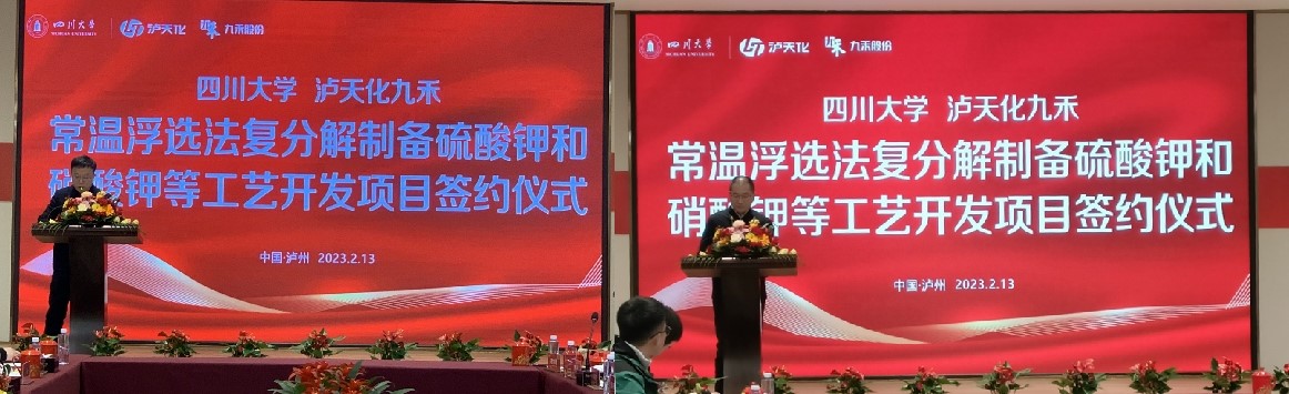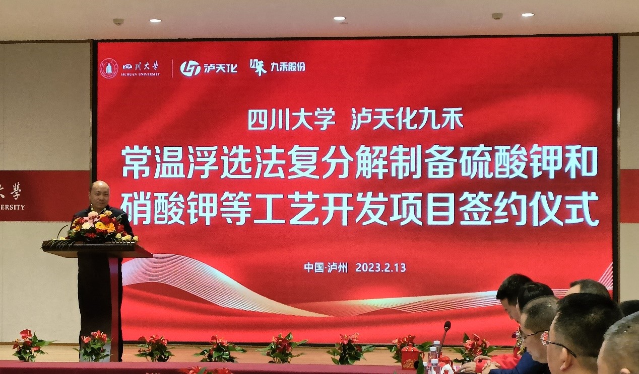 2023年2月13日下午,川大化工与九禾股份科研项目签约仪式在泸天化宾馆隆重举行。泸天化(集团)有限责任公司党委委员、常务副总经理傅利才,泸天化股份有限公司党委副书记、总经理赵永清,泸天化股份有限公司副总郭春建,泸天化(集团)有限责任公司总经理助理、九禾股份有限公司党委书记、董事长田军,九禾股份有限公司党委副书记、总经理冯学宁等公司领导,AV研究所