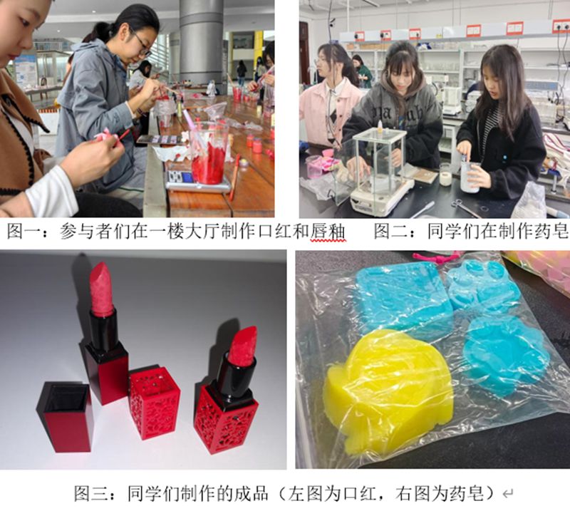 活动伊始,制药工程协会讲解员向不同组的体验学生,介绍了详细的胭脂制作流程,同学们仔细聆听并认真记录相关流程。参加活动的学生们通过讲解了解到胭脂所需的准备材料和工艺流程,激发了大家对中华传统文化的好奇心。随后,大家跃跃欲试,由制药工程协会操作员带领体验者们分组进行制作。其中,在一楼大厅制作口红和唇釉,在第一基础楼三楼A320实验室制作药皂和进行冷凝工作。在老师的指导及工作人员的帮助下,体验者们操作地越来越熟练——溶解、凝结、脱模,每个人都制作出了属于自己DIY的口红、唇釉或药皂。本次活动体验的是制作过程,收获的是开心喜悦,增添的是自信和骄傲!