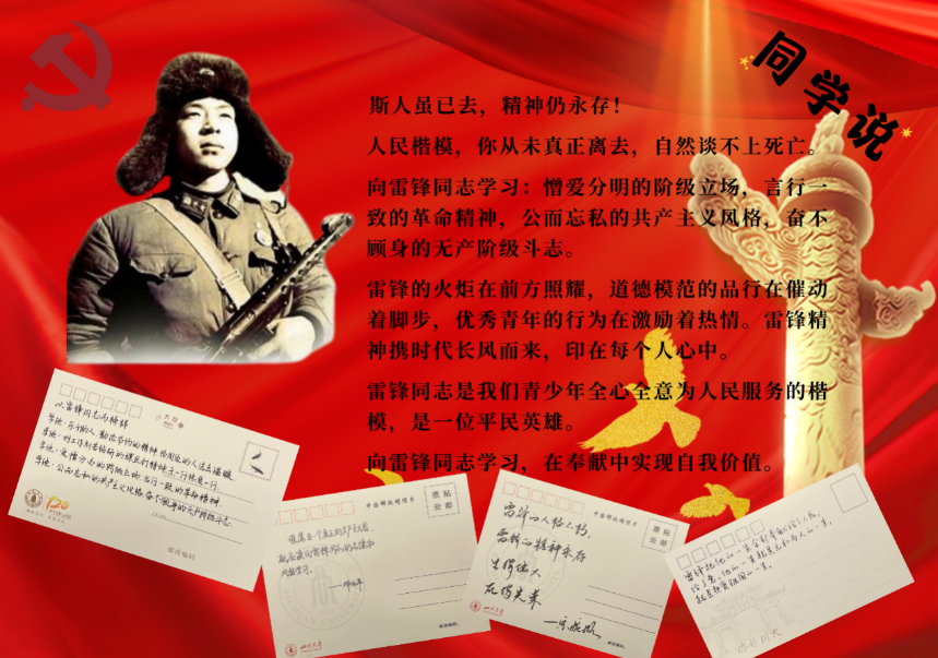 “学习雷锋好榜样”,这是最朴实的一句话,也是对雷锋前辈最好的评价。雷锋同志在平凡中成就不平凡,即使生命停留在22岁,面带笑容的他却成为了我们心目中永远的记忆。雷锋精神,展示了人性最美好的价值追求,有着穿越时空的永恒力量,也是中国精神、中国价值、中国力量的重要组成部分。罗清漪同学为我们分享了暑期在小学支教的志愿故事,我们常常无法做伟大的事,但我们可以用伟大的爱去做些小事。罗清漪同学用自己的实际行动去温暖他们的同时也温暖了自己,尽她所能服务于需要帮助的人,这也是雷锋同志的精神内核所在。接下来,主持人白雅轩向我们展示了部分同学对雷锋同志的评价。通过志愿服务、故事分享等主题实践活动,以实际行动开展对“雷锋精神”的学习与传递。学习领会党的十八大以来习近平总书记关于弘扬雷锋精神的一系列重要论述,深刻把握雷锋精神的时代内涵,让学雷锋在团员青年中蔚然成风,让雷锋精神在新时代绽放更加璀璨的光芒。