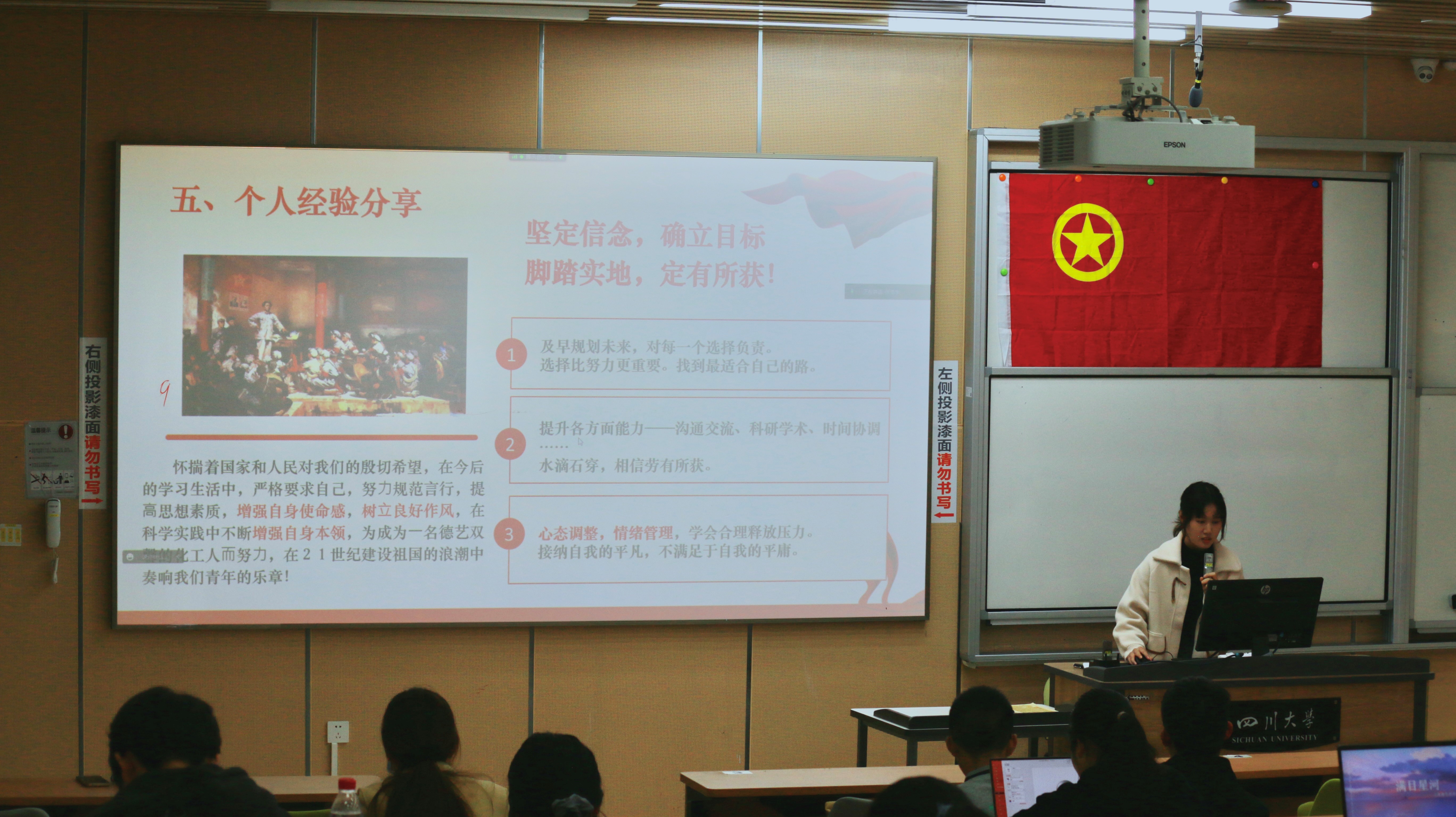 首先是“老师说”,姚长洪老师由二十大精神以及新时代新征程中国共产党的使命任务引入了对“二十大”精神的感悟和阐释,指出了专业目前的广阔前景,也说明了中国科技自立自强必须解决的问题:仪器设备严重依赖进口、重要数据库依赖国外、评价体系国外化以及把握第四次工业革命——人工智能,在分享的最后,姚长洪老师也提出了他对我们的寄语,希望我们能脚踏实地,夯实基础,拓展能力,开阔视野和保持身心健康,引导我们树立正向价值观,树立新学期全新目标,厚植家国情怀、涵养进取品质,将远大的理想转变为现实行动。