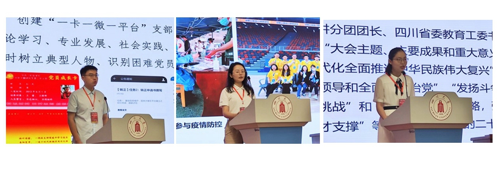 华西口腔医学院牙体牙髓研究生第二党支部王海溦同志分享了党支部“一卡一微一平台”的支部建设法。西南石油大学机电工程学院钻井提速科研团队党支部何灵同志阐明了“二十大精神赋能支部阵地建设、新征程赶考践行党员初心使命”的主题。成都中医药大学针灸推拿学院博士党支部李雪梅同志展示了“个人学·集体议·专家讲·榜样带·实践悟”五位一体的二十大精神学习模式。