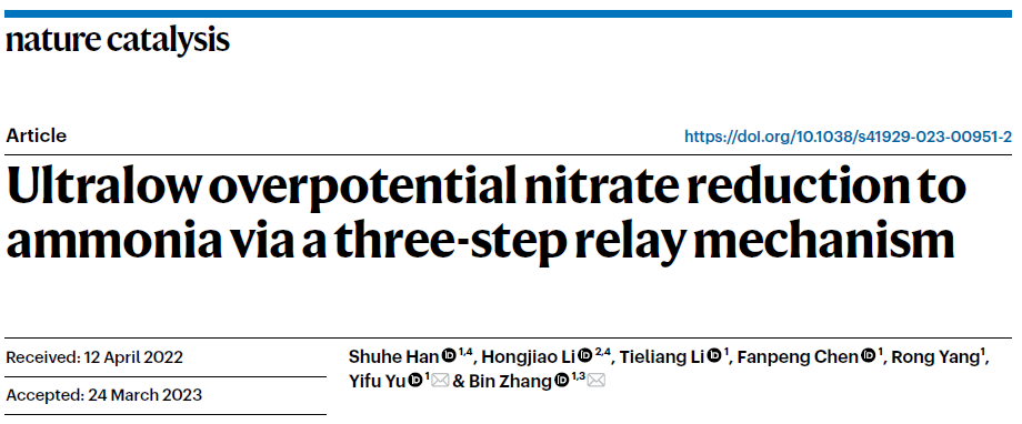 李红娇特聘副研究员与天津大学张兵教授、于一夫教授团队合作,负责三步接力催化实现超低过位硝酸盐电还原过程的理论模拟工作,以共同一作在Nature Catalysis上发表相关工作论文。