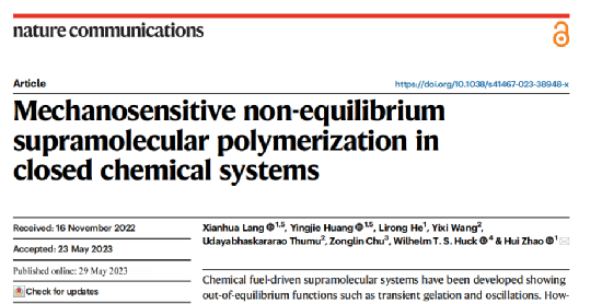 赵辉教授团队在NatureCommunications上发表了题为“Mechanosensitive non-equilibrium supramolecular polymerization in closed chemical systems”的研究论文。该研究主要通过模拟生命体的动态行为构建了密闭体系中的非平衡态的超分子自组装系统。郎咸华博士和黄英杰博士研究生为该论文的共同第一作者,赵辉教授为文章通讯作者,AV研究所