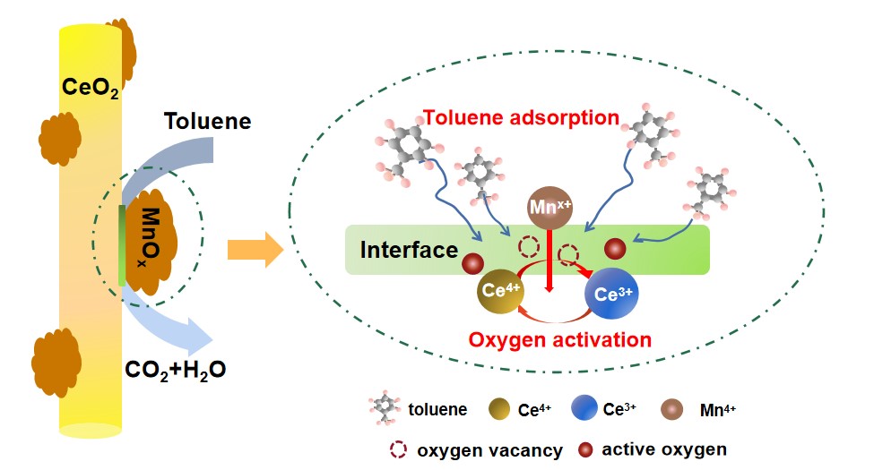 唐文翔特聘研究员、唐盛伟教授团队提出构建高效非贵金属氧化物异质界面结构的强化策略,采用简单的湿化学浸渍在纳米CeO2表面进行MnOx纳米颗粒的修饰,从而构建与MnOx的异质界面结构。结果表明:异质界面缺陷及其所造成的不饱和环境(如Ce3+)有助于形成活性氧,而且MnOx的加入能降低Ce-O键的强度,促进Ce4+与Ce3+之间的转化,利于氧的活化与迁移。与没有协同作用的CeO2、负载型的MnOx-SiO2以及物理混合型的MnOx+CeO2相比,新型MnOx-CeO2异质结构催化剂对低浓度甲苯分子吸附能力会得到明显加强。相关成果 “Low-Temperature Oxidation of Toluene over MnOx-CeO2Nanorod Composites with High Sinter Resistance: Dual Effect of Synergistic Interaction on Hydrocarbon Adsorption and Oxygen Activation”发表于Inorganic Chemistry (doi.org/10.1021/acs.inorgchem.2c02738)。