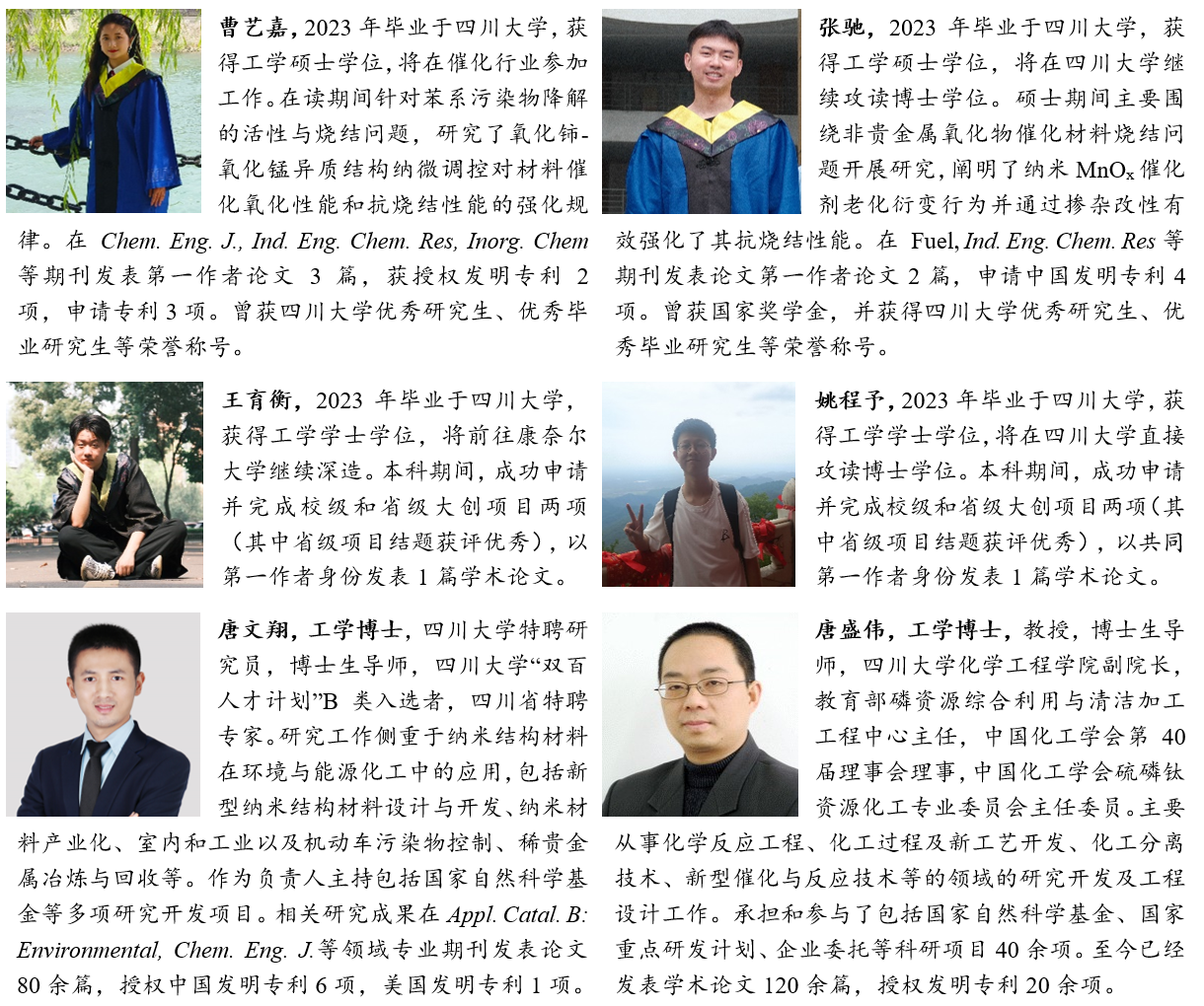 此外,团队还尝试采用纳米模铸法与一步燃烧法构筑Ce-Mn异质结构,其对催化降解苯系物的低温活性都具有显著强化效果,相关成果发表于Industrial & Engineering Chemistry Research(doi.org/10.1021/acs.iecr.2c03828)和CeramicInternational(doi.org/10.1016/j.ceramint.2022.09.090,本项成果主要由2023届本科生王育衡与姚程予同学完成)。系列成果同时获得2项中国发明专利授权(ZL202110667647.X;ZL202210788735.X)。团队工作为设计兼顾优异低温活性和抗烧结性的高效非贵金属基催化剂提供了一种有效策略,将进一步推进非贵金属催化剂在VOCs污染物去除中的实践应用。