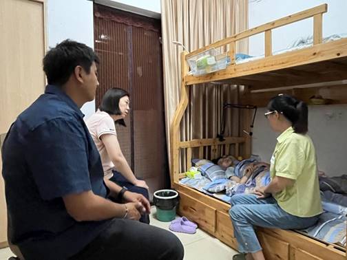 在走访完新生宿舍后,姜书记特地来到互联化工501班彭曦同学的宿舍,与彭曦及其母亲进行交流,询问其生活是否还方便,还有哪些需要帮助的地方。彭曦同学幼时被诊断为肌无力,被判定为三级肢体残疾,初中时发现患有脊柱侧弯,开学前进行了矫正手术。学校在了解相关情况后第一时间为彭曦及其母亲安排了单独的宿舍,方便彭曦更好的度过手术恢复期。