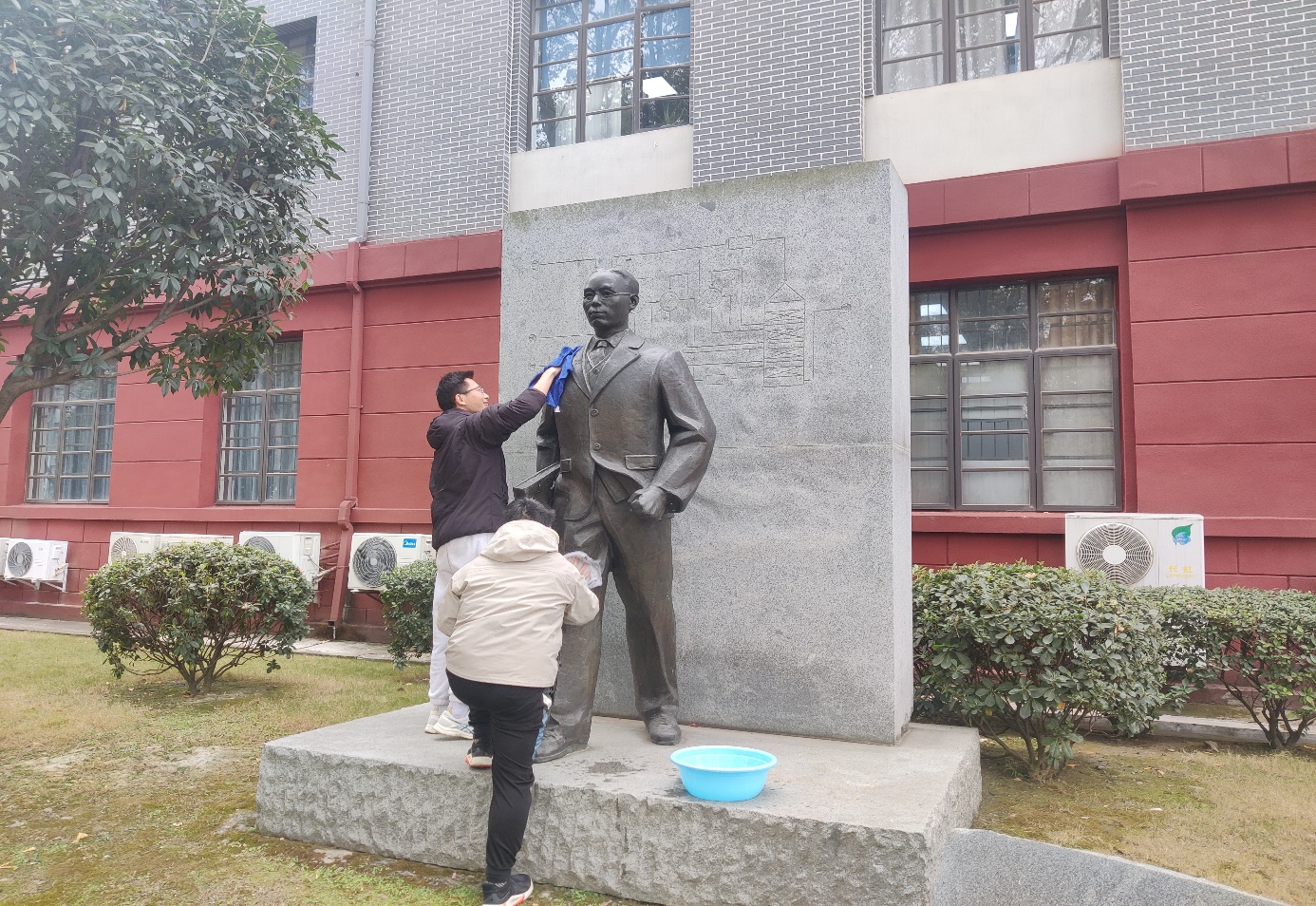 支部同志清洗张洪沅先生铜像