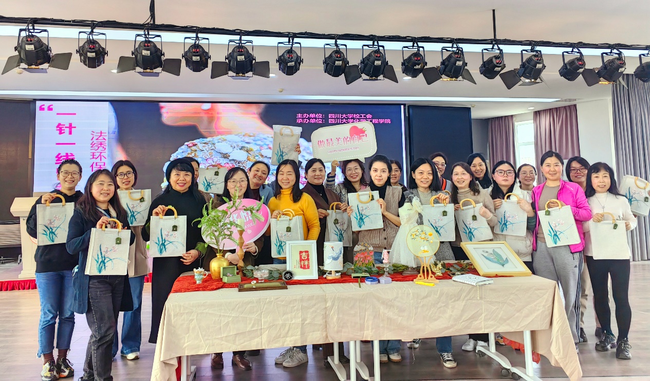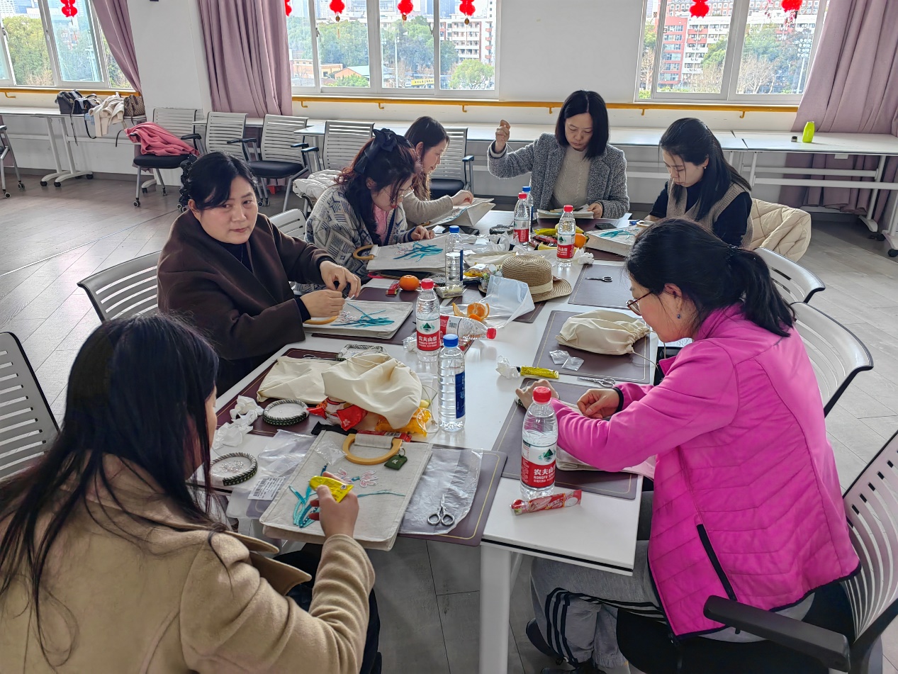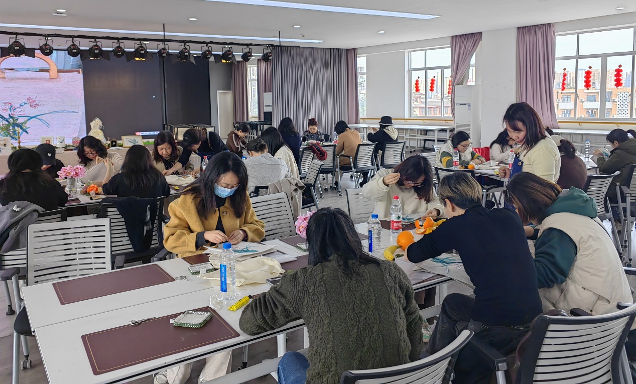 工会承办的“一针一线皆关情”工会女职工女性魅力展示系列主题活动之法式刺绣品鉴和手提包制作活动于3月13日下午在文华中心六楼多功能厅顺利举办,活动吸引了来自校内多个单位60余位女职工的热情参与。校工会王蕾、杨秀建等老师也来到活动现场,全程组织参与。