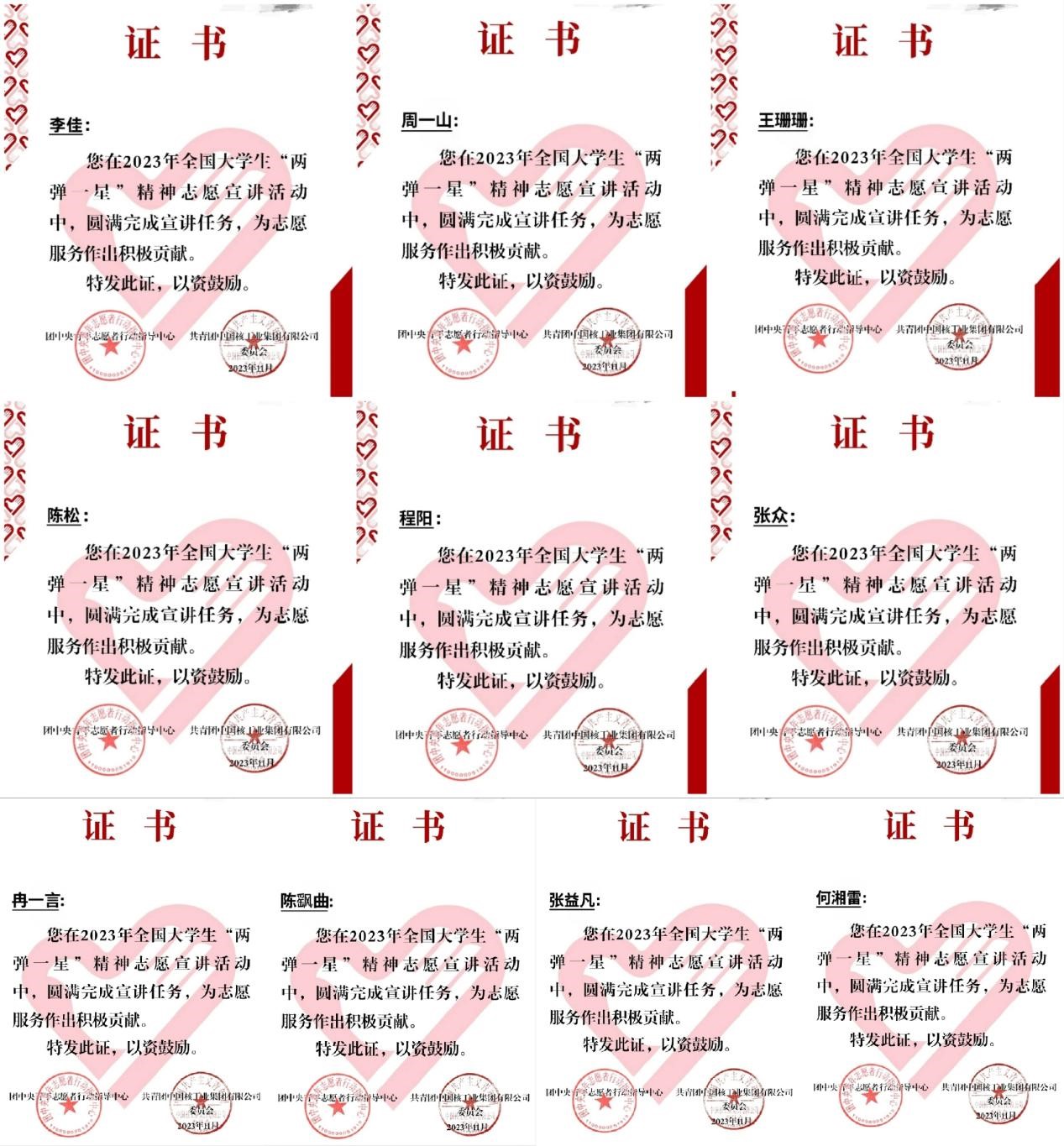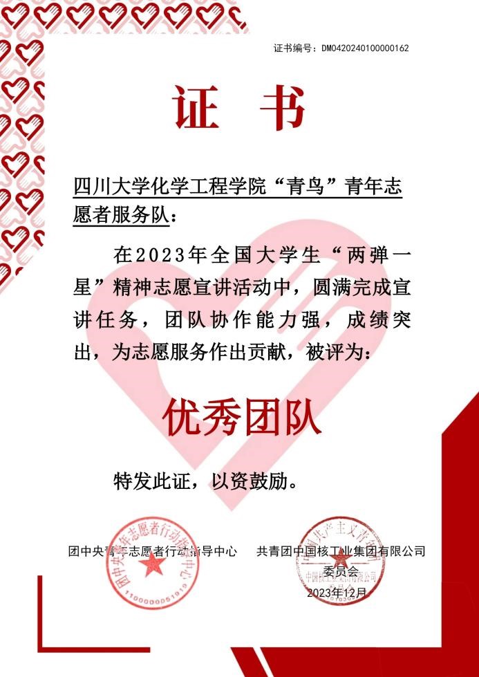 “青鸟”青年志愿宣讲团,作为全国1000支“两弹一星”精神志愿宣讲服务队,在2023年积极报名并圆满完成了由团中央青年志愿者行动指导中心、中国核工业集团有限公司联合开展的2023年度“两弹一星”精神志愿宣讲活动,并获评全国百个“优秀团队”。