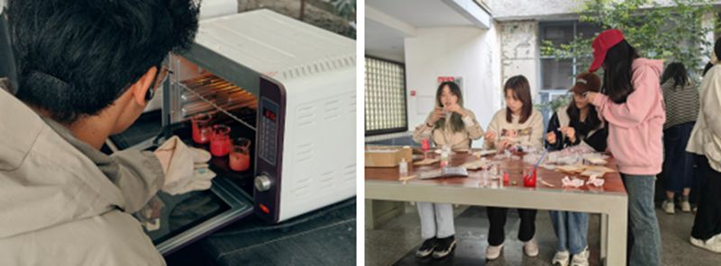 活动开始,志愿者们为不同组的体验学生准备制作所需材料,同时介绍了详细的胭脂制作过程。随后,由志愿者操作员带领体验者动手制作口红、唇釉等。