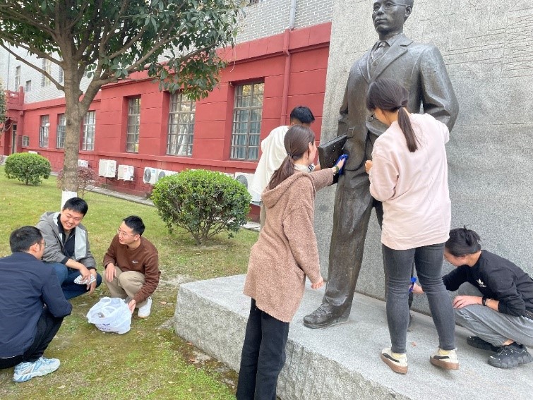 门前的落叶进行清扫,对张洪沅先生雕像进行了清洗。