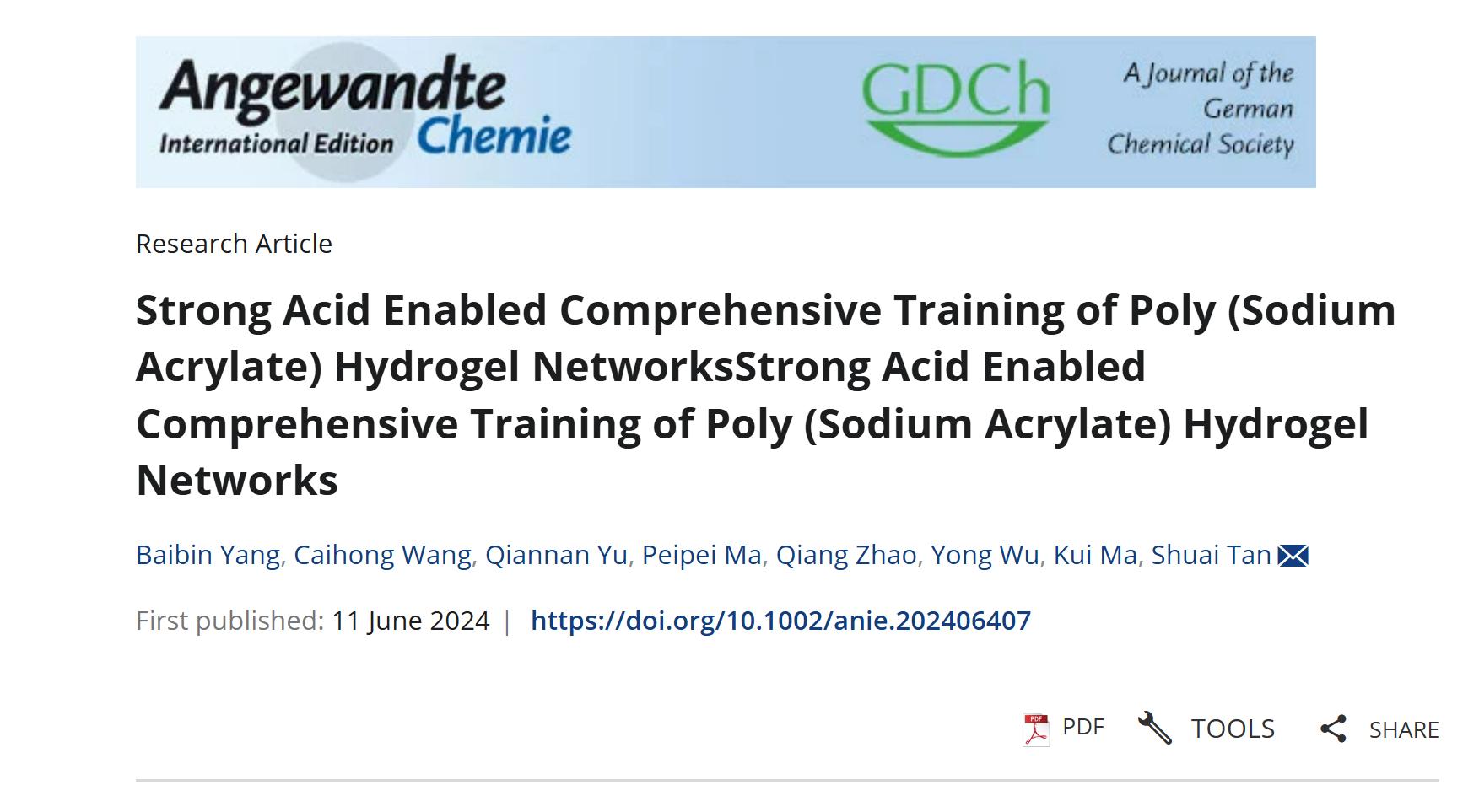 谭帅副教授开发了一种强酸耦合机械训练实现聚丙烯酸钠水凝胶综合性能强化的新策略。通过将聚丙烯酸钠水凝胶浸入4 M H2SO4溶液中,强酸溶液耦合机械训练会促使聚丙烯酸钠网络逐渐转化为聚丙烯酸网络,从而形成丰富的动态氢键相互作用。氢键作用赋予了酸浸泡的聚丙烯酸钠水凝胶出色的抗溶胀和自愈性能,并显著提升了其机械性能。相关工作以“Strong Acid Enabled Comprehensive Training of Poly (Sodium Acrylate) Hydrogel Networks”发表在《Angewandte Chemie International Edition》。
