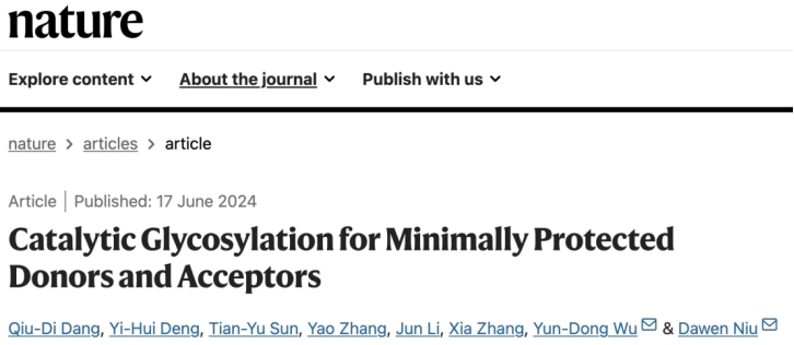 钮大文教授团队联合北京大学深圳研究生院吴云东教授在Nature发表题为“Catalytic Glycosylation for Minimally Protected Donors and Acceptors”的研究文章。研究开发了一个通用平台,用于未保护或受保护程度极低的供体和受体之间进行位点、立体和化学选择性O-糖基化反应。这项研究利用催化剂实现了高选择性糖基化反应,为糖化学领域中“选择性控制”这一长期挑战带来了全新思路,有望极大降低糖类化合物合成的难度,为探索糖类化合物的功能提供技术支撑,代表了糖化学领域的重大进展。