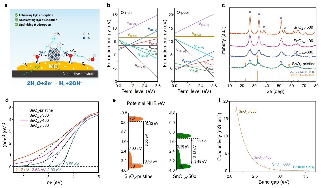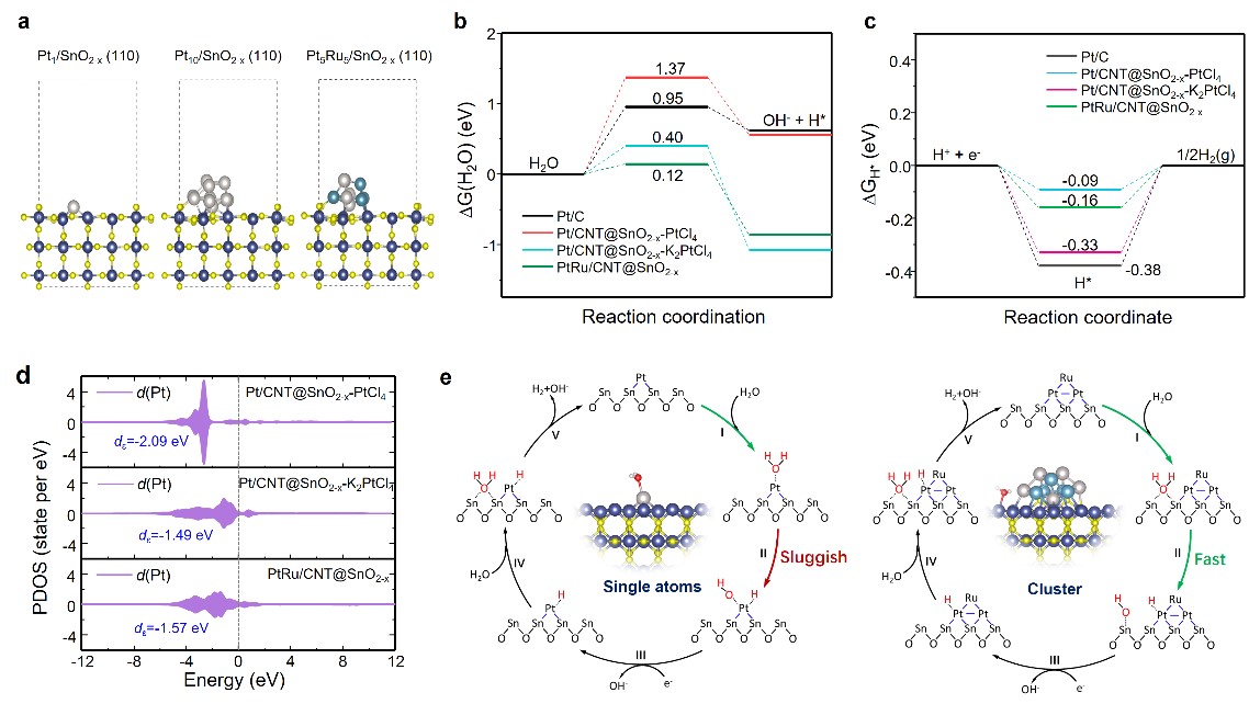 本文首先通过在金属氧化物中引入氧空位来提升材料电导率,然后通过电化学沉积原位负载HER活性位点,并通过对金属氧化物的优化,构筑了高效的碱性HER催化剂。实验和理论计算结果表明,PtRu/CNT@MO2-x催化剂高效碱性HER的机理如下:(1)金属氧化物的氧空位改善了催化剂导电性,促进了H2O的吸附;(2)PtRu团簇与MO2-x之间的异质界面促进了H2O的解离;(3)Ru修饰优化了H在Pt位点上的吸脱附行为,并进一步降低了水解离能垒。研究结果还表明,追求贵金属的极端原子利用不一定是开发高效碱性HER催化剂的最佳方案。PtRu/CNT@CeO2-x催化剂表现出优异的碱性HER性能,Tafel斜率仅38 mV dec-1,HOR/HER活化能低至7.93 kJ mol-1。70 mV过电位下质量活性(12.3 mA μgPt+Ru-1)和比活性(32.0 mA cmECSA-2)分别达到商业Pt/C催化剂的56倍和64倍。