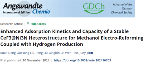 吉俊懿教授团队报道了一种具有优异甲醇氧化活性的CeF3@Ni3N复合材料,通过CeF3调节Ni3N的电子分布,增强甲醇和OH-在活性位表面的吸附动力学与吸附容量,在大电流密度下维持甲醇氧化反应良好的法拉第效率和稳定性。相关研究成果“Enhanced Adsorption Kinetics and Capacity of a Stable CeF3@Ni3N Heterostructure for Methanol Electro-Reforming Coupled with Hydrogen Production”发表在《Angewandte Chemie International Edition》上,AV研究所