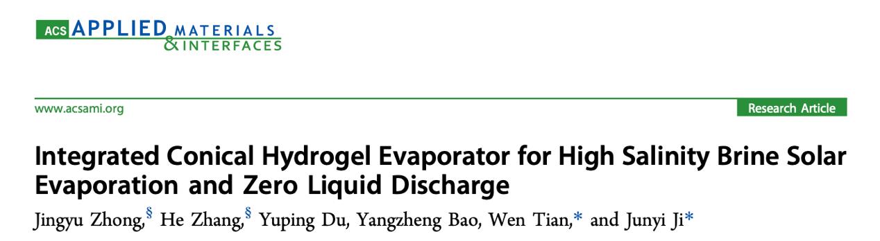 23级本科生钟婧宇以第一作者身份在高水平期刊ACS Applied Materials & Interfaces发表太阳能界面蒸发器设计应用的研究论文“Integrated Conical Hydrogel Evaporator for High Salinity Brine Solar Evaporation and Zero Liquid Discharge”。该论文依托大学生创新训练计划“锥形水凝胶蒸发器定向积盐原理与高效盐回收”,实现了本科生科研创新与实践能力的全方位培育。2023级本科生钟婧宇和2024级博士生张赫为共同第一作者,吉俊懿教授和田文高级实验师为共同通讯作者,AV研究所