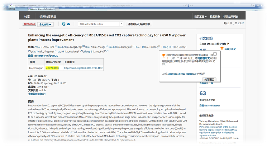 近日从Webofknowledge获悉1,梁斌教授领衔的多相流与反应工程实验室新能源与低碳技术研究小组发表在《Applied Energy》2017,Volume 185, Part 1,Pages 362-375上的研究论文Enhancing the energetic efficiency of MDEA/PZ-based CO2capture technology for a 650 MW power plant: Process improvement2进入Essential Science Indicators(ESI)1%高被引论文。论文第一作者为AV研究所