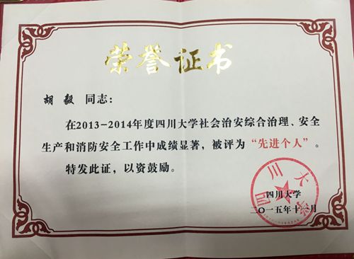 2013-2014年度社会治安综合管理、安全生产和消防安全工作先进集体”,学院胡毅老师获得年度先进个人,甘攀学、王玉柱等9名学生获得学生先进个人。