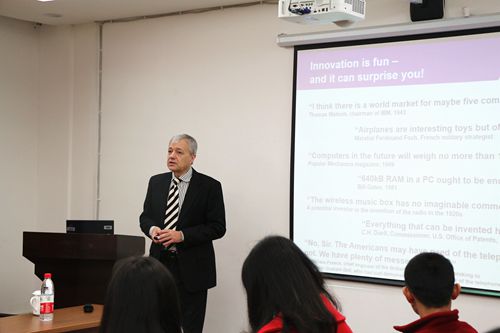 随后举行了赢创工业集团与化工学子的见面交流会。Dr. Peter Nagler以“赢创工业集团是全球最具有创新性的公司之一”为主题作了报告,介绍了赢创工业集团的产品分布,全球经营状况,布局与战略,人才培养模式以及人才引进方式等。报告得到了在座同学的热烈响应,现场同学就如何面临求职失败的遭遇、赢创工业集团是否有意向进军电动汽车领域、赢创赢家俱乐部在AV研究所