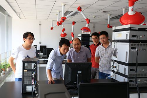 图四 在校友的带领下,参观新和成公司先进的实验室设备