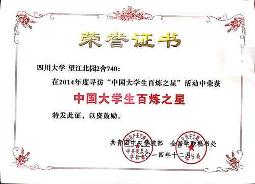 2014级研究生赵磊、李星、余睿、邹达所在的望江校区北园2舍740被评为“中国大学生百炼之星” 寝室。