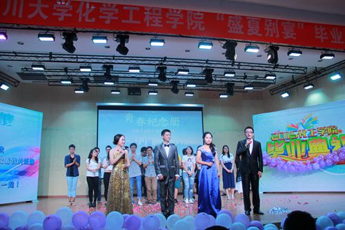 晚会分为星空、笑忘歌、后青春的诗三个篇章。在第一篇章,首先上场的是由王鹏、邹笑一、付丽、李鑫海四位同学带来的歌曲串烧《离•歌》,他们用不同的语言、不同的风格、不同的腔调表达出同一种感情——离别。接着是由化工教职工舞蹈队带来的藏族舞蹈《翻身农奴把歌唱》,老师们出色的表演,再现了西藏人民的新生活和新风貌,同时表示出对美好生活的企盼和最真挚的祝福。小品《智取威虎山》,两个和蔼可亲的“胖子”,用他们精辟的对话、经典的动作,吊足了观众的胃口。在笑忘歌篇章,徐卡秋老师的一曲《红梅花儿开》嘹亮婉转,将全场观众带入到了另一个广阔天地,伴随着歌曲的结束,现场掌声一片。紧接着是三年来一直陪伴大家的学院行政工作人员及辅导员老师带来的健美操《LaLaLa》,热辣的健美操瞬间激昂了现场的气氛,同时也把晚会推向了高潮。伴随着台下阵阵笑声,第二篇章在小品《开会请关手机》中结束。第三篇章,首先上场的是由学院本科同学为送别师兄师姐而带来的现代舞《mamamia》,他们迅速而娴熟变幻的动作,多变的Pose,不仅体现出了他们台下的辛苦演练,也淋漓尽致地表现了院长褚良银教授说的“青春时期是最精力旺盛、最朝气蓬勃的时期”。朗诵《栀子花开的路口》,四位同学用动情的字眼,道出了无数人的心声。他们眼中的红瓦寺街、小北门、时光走廊,又勾起了大家无穷无尽的回忆以及对母校的深深眷恋。。整个晚会,伴随着压轴节目小合唱《青春纪念册》的结束圆满落下帷幕。