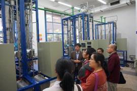 参观完过控专业实验室后,诸位老师在实验中心主任余老师的带领下参观化工原理实验室,并详细的介绍学院自行设计和研发的实验装置,如气流干燥和边界层实验、精馏实验、传热试验等装置;诸位老师认真细致观看实验装置,并广泛的对新建装置进行热烈的交流和讨论,余老师热情详细的讲解更使到访老师不时点头称赞!在参观完气体吸收实验室后,余老师带领诸位教师登上学院工业实物教学装置进行实地观摩,在一片热情交流的气氛中,余老师和诸位老师在实物教学装置前合影留念。