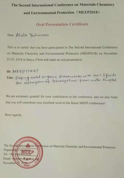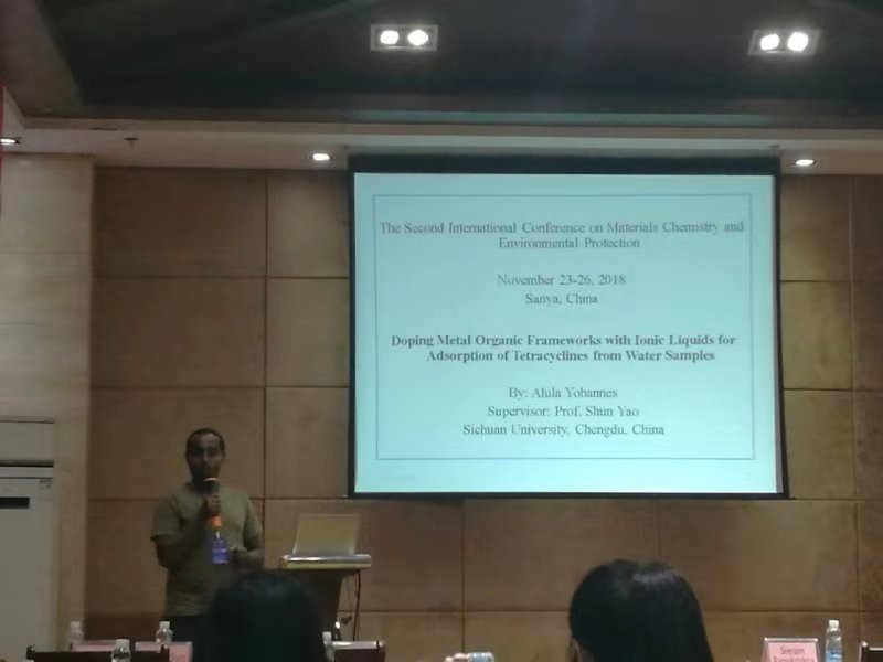 制药工程专业三年级博士研究生Nigussie Alula Yohannes(埃塞俄比亚籍)出席该会议并于大会上作题为“Doping Metal Organic Frameworks With Ionic Liquids For Adsorption Of Tetracyclines From Water Samples”的研究报告。本次会议吸引了众多来自材料化学、分离科学、化学工程及环境工程等不同研究领域的研究员、科学家、工程师和学者,是AV研究所