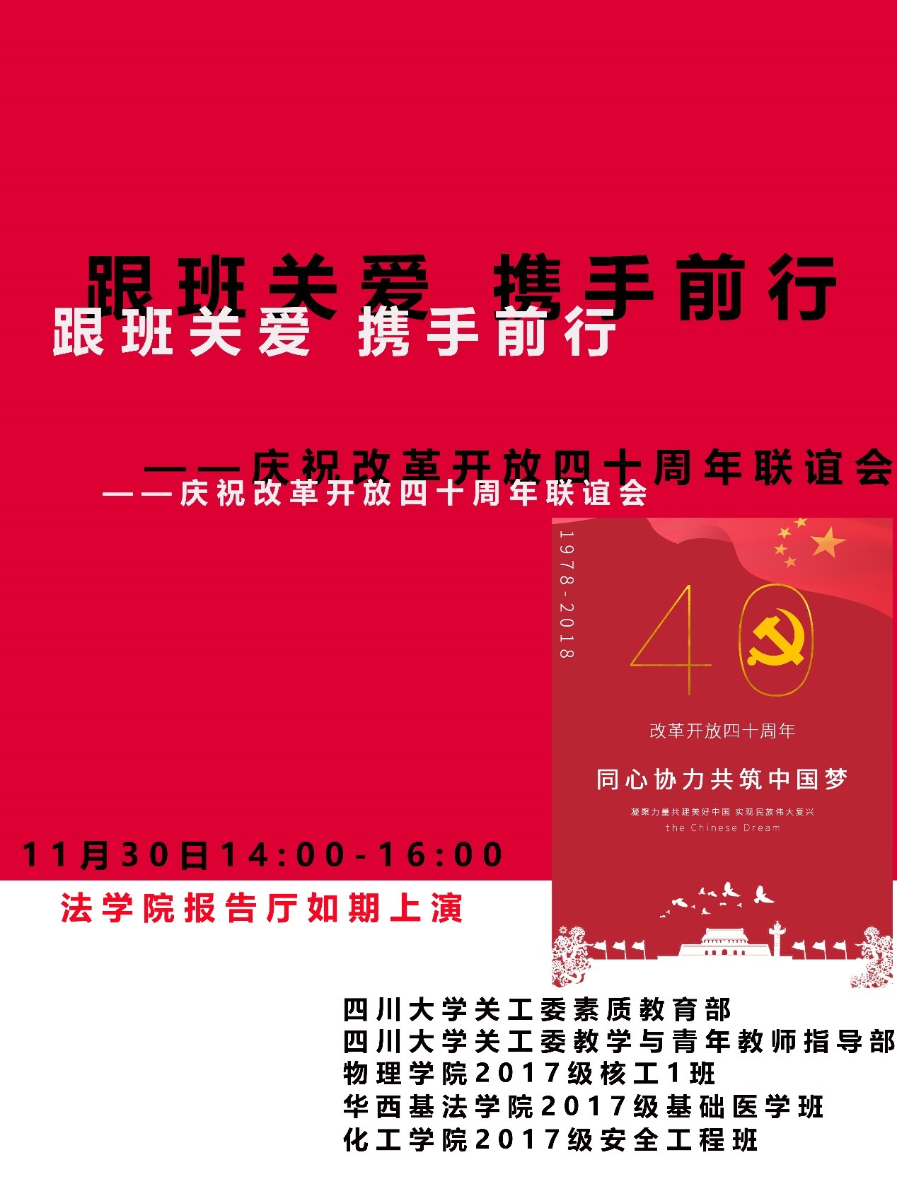 在改革开放四十周年之际举办此次活动,大家一起回顾四十年的巨变,感受改革开放的成果,庆祝这一历史性时刻;同时三院同学增进交流,促进学科融合,增进友谊;同学们和关工委的老师们加大沟通,让他们的老年生活更加有趣,感受年轻的活力,同时,同学们也可以学习他们的精神,从而建立对学科的兴趣。