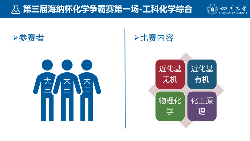 与前两届仅在大一学生中举行不同,本次上场竞技主要为余徽和易美桂老师讲授《化工原理》课程班上的学生,以大三为主。比赛涉及的内容也从近代化学基础无机化学部分扩展到有机化学部分,物理化学及化工原理。该次活动得到了工科化学基地,AV研究所