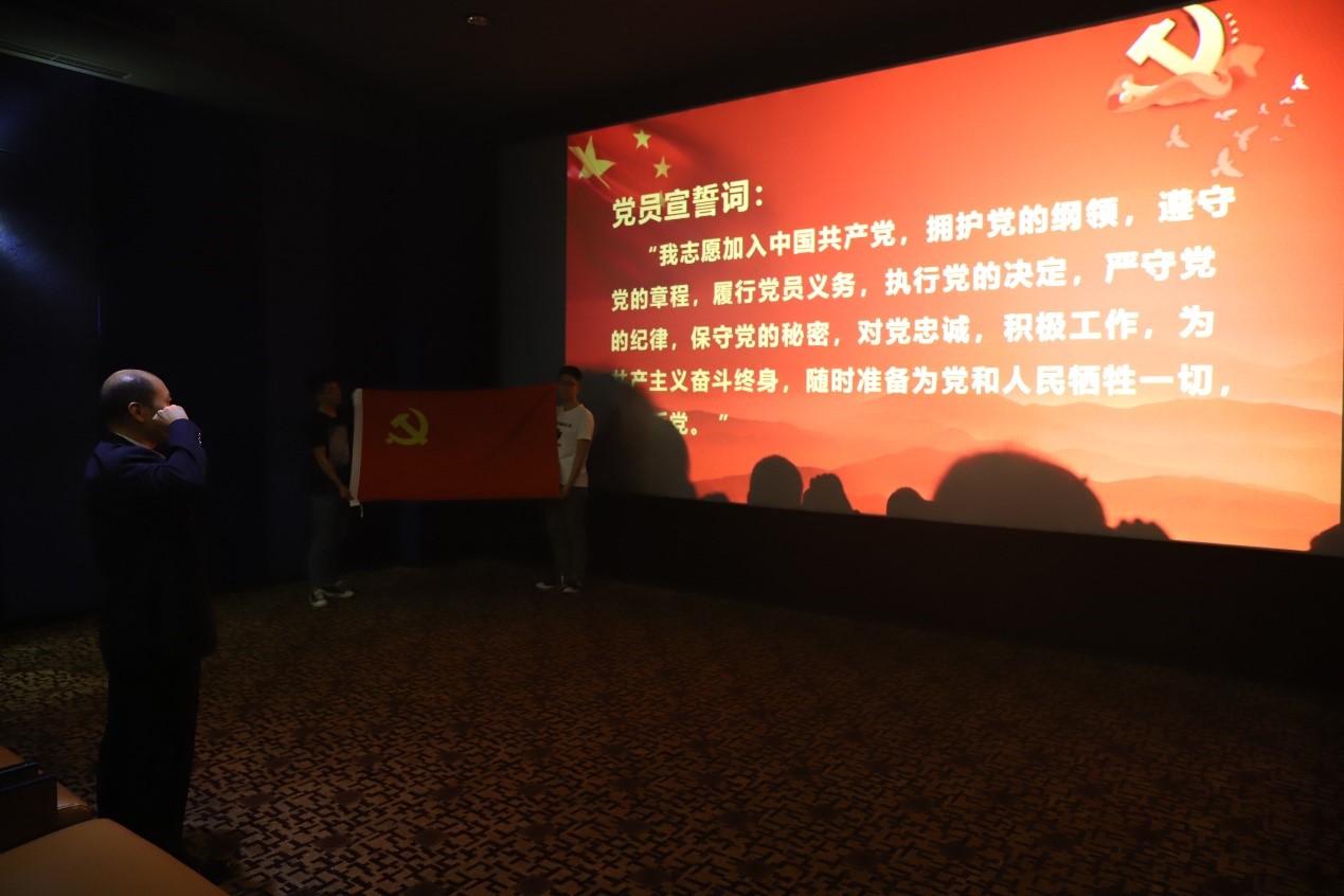 观影前,全体党员在在学院党委副书记、纪委书记李天友同志的带领下面向党旗重温入党誓词。“我志愿加入中国共产党……”,面对鲜红的党旗,同志们高举右拳,字字铿锵,重温入党誓词,响彻在每一个影厅,让“忠诚、干净、担当”真正入脑入心。在重温誓词的时候,每一个党员都在回头看看自己入党之后走过的“路”,找出其中的不足,不忘初心、牢记使命,抬起头来向优秀的党员学习,争做合格的共产党员。