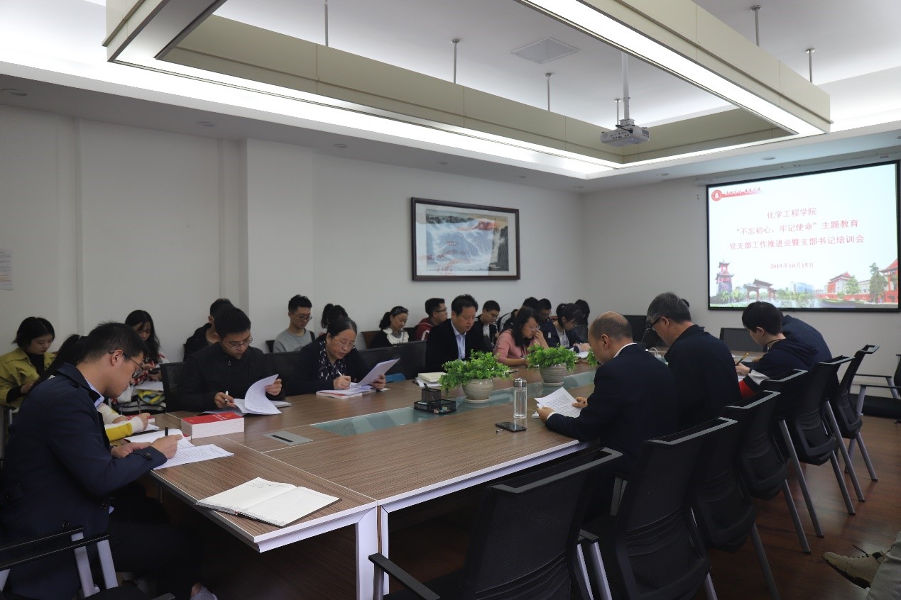 在望江校区化工楼227会议室组织开展“不忘初心、牢记使命”主题教育党支部工作推进会暨党支部书记培训会。学院党委书记庞国伟、党委副书记兼纪委书记李天友、党委副书记姜利寒,学院党政办主任李晓燕、党建管理科科长高敏和全体支部书记参加此次会议。