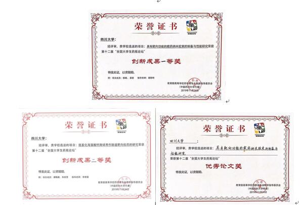 制药工程专业16级本科生杨蝶、易丽的参赛作品《具有靶向功能的纳米载药胶束的制备与性能研究》(指导老师:葛黎明助理研究员)荣获“创新成果一等奖”和“优秀论文奖”;生物工程专业16级本科生谭魏葳、朱桂莹的参赛作品《巯基化海藻酸钙微球用作肠道靶向给药的研究》(指导老师:李德富副教授)荣获“创新成果二等奖”。