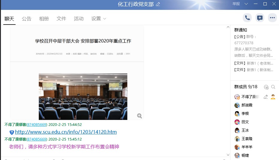 会后,以各(系、基地、中心)和各党支部为单位,学院全体教师通过QQ群、微信群、微信推送、视频会议等多种形式对学校2020年工作布置视频会议精神进行了学习。